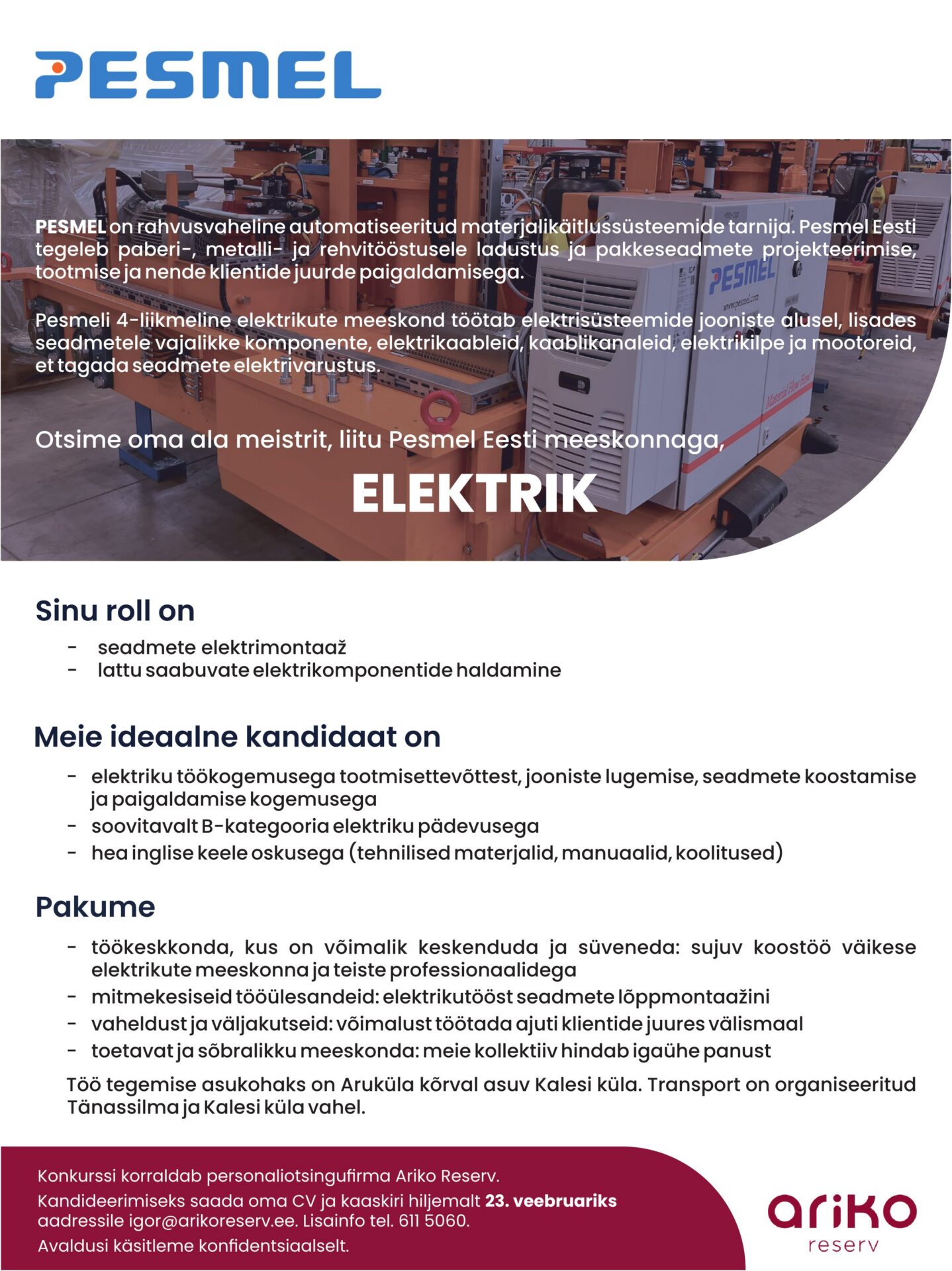 Täistööaeg Kalesi, Harjumaa Avaldatud 2 päeva tagasi Aegub 23. veebr. 2026 Veebilehekülg Pesmel Eesti AS Nutikad ja automatiseeritud tehnoloogilised lahendused tööstustele. CV ja kaaskiri Failiformaadid: doc, docx, odt, pdf. Maksimaalne faili suurus 5MB. Olen lugenud ja nõustun privaatsustingimustega Nõustun andmete säilitamisega ja kontakteerumisega Saada